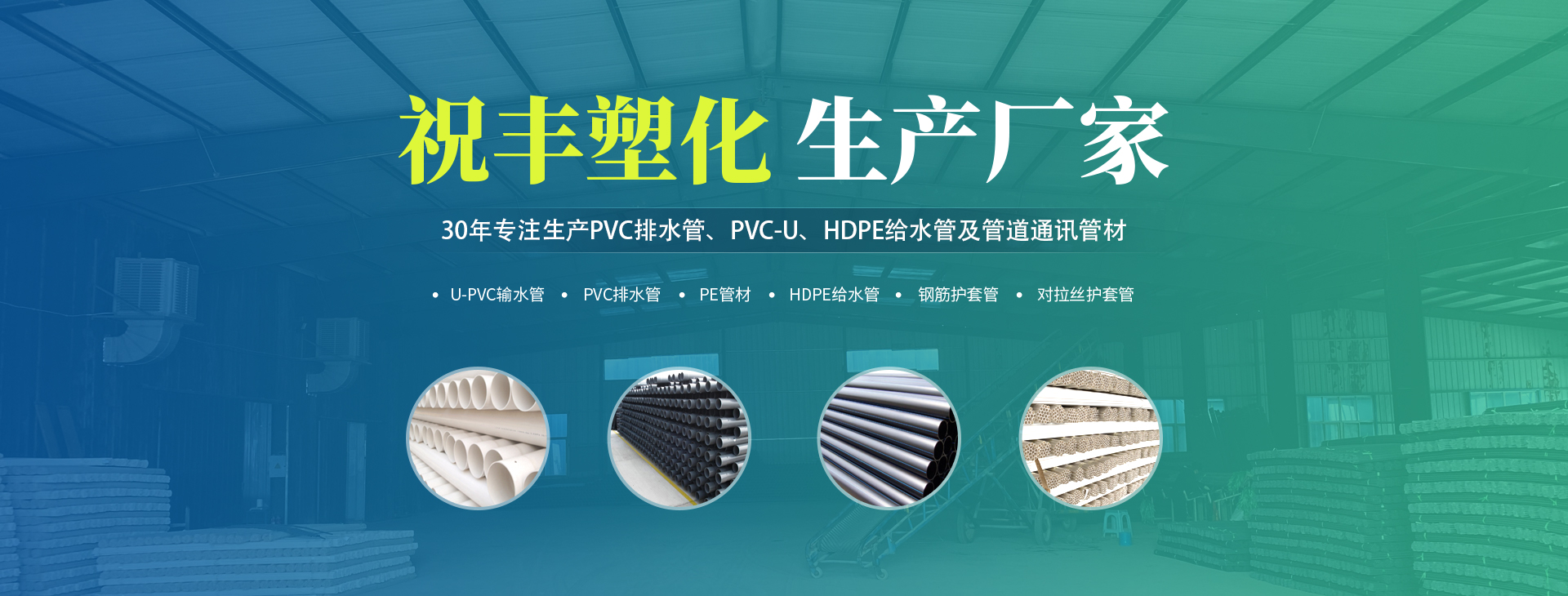 安陽市祝豐塑化有限公司坐落在滑縣工業(yè)園區(qū),東臨大廣高速,西臨京珠高速,是鄭州、鶴壁、安陽、濮陽四個城市的輸紐,交通便利、環(huán)境優(yōu)美。 公司始建于八十年代,經過二十余年的艱辛創(chuàng)業(yè),規(guī)模不斷壯大,由十多萬元資產的小廠,發(fā)展到現占地面積達一萬多平,建筑面積一萬平,資產2000多萬元管材生產企業(yè)。公司生產PVC-U、PVC排水管、HDPE給水管、鋼筋護套管管道通訊管材等產品,廣泛用于農田節(jié)水、高山引水、人畜用水、建筑、電力通訊等多種用途,品種齊全。為了滿足用戶需求,可承攬各種給水、節(jié)水、灌溉工程。“祝豐塑化”憑借強勁的實力,優(yōu)良的管理水平?!耙再|量求生存,以信譽求發(fā)展”的原則全力以赴和大家共同塑造美好未來。..